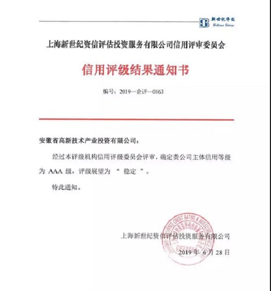6月28日,上海新世纪资信评估投资服务有限公司出具评级报告,评定省高新投公司主体信用评级为AAA,评级展望为“稳定”,这充分体现了权威机构、资本市场对公司信用水平和省高新投母基金运营能力的高度认可,标志着省投资集团产业板块整体实力的进一步提升。